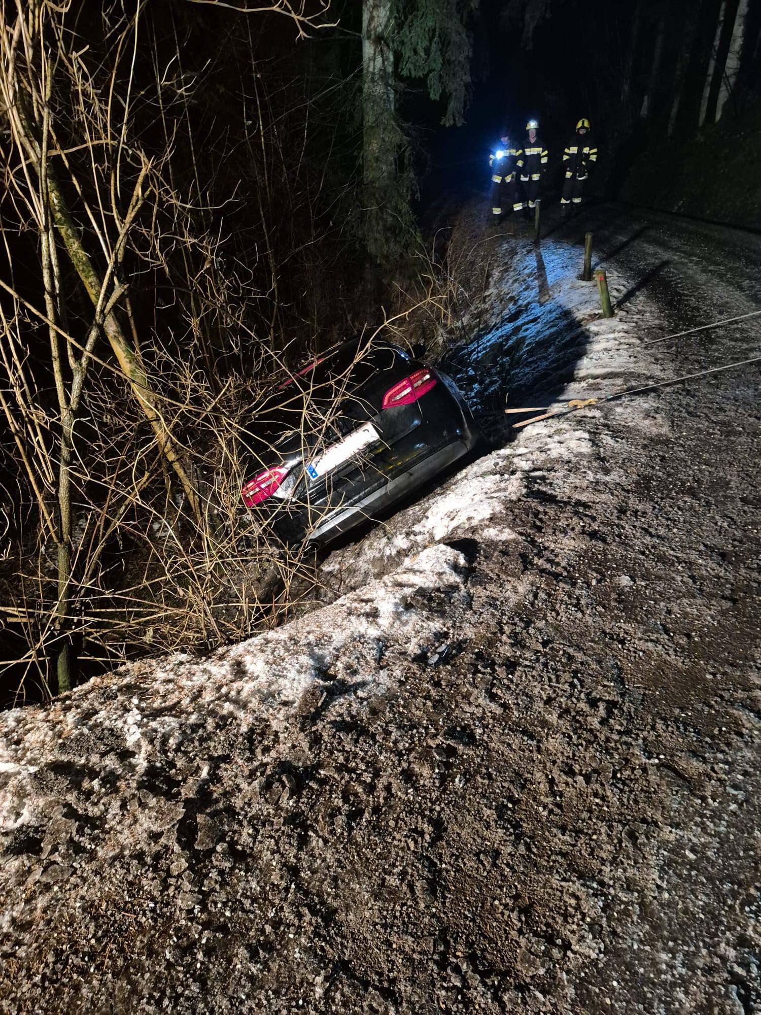 Fahrzeugbergung - PKW von Straße gerutscht lautete der Einsatzbefehl. Die Feuerwehr Oberaich war mit dem RLF-T und MTFA mit 12 Mann im Einsatz. Da keine Gefahr bestand wurde für die Bergung des Fahrzeuges die Firma Koman verständigt.